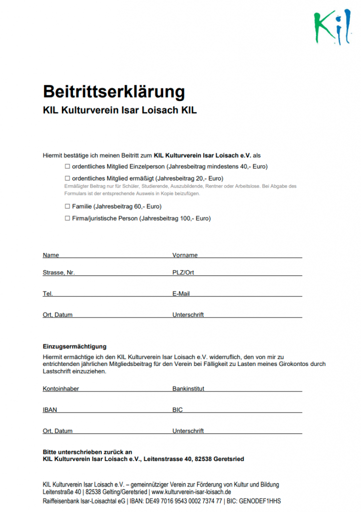 Der KIL Kulturverein Isar Loisach - Verein zur Förderung von Kultur und Bildung - wurde am 21.September 2012 im Wirtshaus Flößerei in Wolfratshausen gegründet.